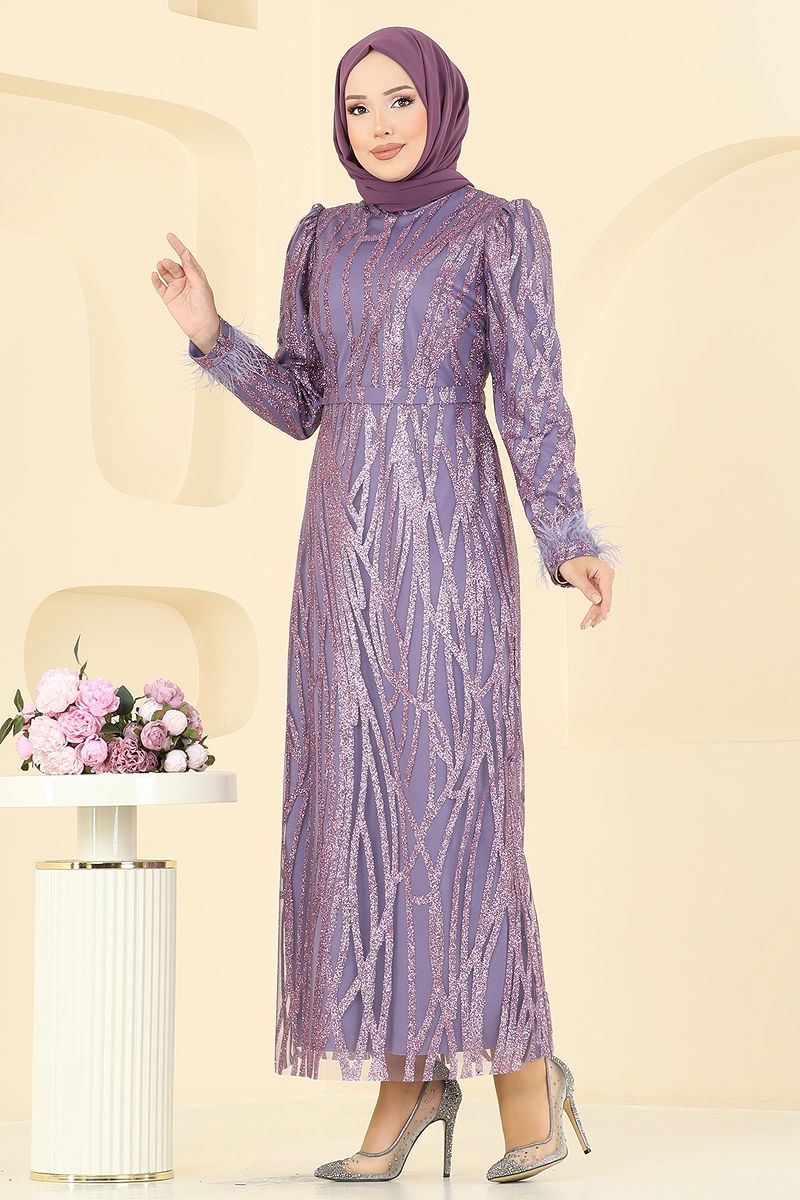 The Manşeti Otrişli Simli Abiye, a standout hijab fashion item, dazzles with its unique and elegant design. Suitable for all seasons, this glamorous dress is made from sparkly tulle fabric. It features a semi high-neck and a zipper at the back, ensuring style and comfort with its lined design. The dress is accentuated with stitched waist details and attached ostrich feathers, adding an extra touch of elegance. This exquisite garment should only be dry cleaned.