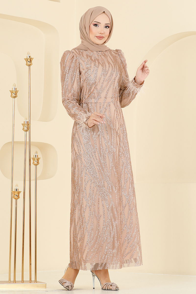 The Manşeti Otrişli Simli Abiye, a standout hijab fashion item, dazzles with its unique and elegant design. Suitable for all seasons, this glamorous dress is made from sparkly tulle fabric. It features a semi high-neck and a zipper at the back, ensuring style and comfort with its lined design. The dress is accentuated with stitched waist details and attached ostrich feathers, adding an extra touch of elegance. This exquisite garment should only be dry cleaned.