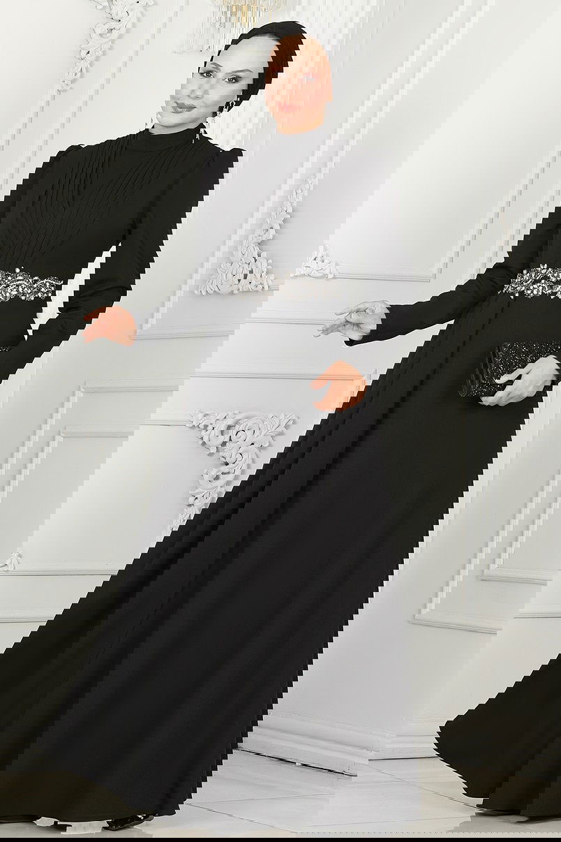 Beli Taş İşlemeli Abiye is a seasonless occasion dress that requires dry clean only. It is made of premium Dabıl fabric and features a half mandarin collar. This unlined dress is a size 38 and has a back button. The stones are adhesive and it should be put on like a sweater.