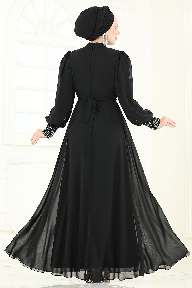 The Stone-Detailed Chiffon Hijab Evening Dress is an elegant choice suitable for all seasons. This special garment, which should only be dry cleaned, is made from high-quality chiffon fabric. It features a high collar design and is fully lined, offering both comfort and style. The back zipper makes it easy to wear. Cuff buttons are active. Adorned with elegant stone details, the dress catches the eye with its wavy belt design. The belt is stitched at both ends and left unstitched in the middle, providing a modern touch. The belt comes with the dress and can be optionally removed.