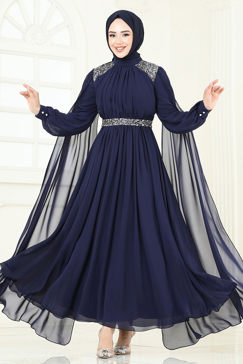 Designed with chiffon fabric and cape sleeves, this special evening dress is an ideal choice for women who embrace modest fashion. Suitable for use in all seasons, it requires dry cleaning due to its delicate structure. The stand-up collar and lining enhance its elegance, while the zippered back offers easy wearability. This dress, sized 38, features glued-on gem details and an included belt that can be worn at will. The cape is permanently attached to the dress, adding a unique touch that will catch all eyes.
