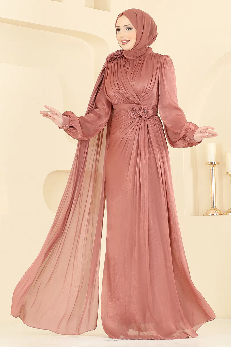 Elevate your elegance with the Floral Detailed Chic Evening Dress, perfect for all seasons. This modest evening dress combines comfort and elegance with its shiny fabric and flexible lined design, ensuring a stunning appearance at your special occasions and events. Featuring a rear zipper, stand-up collar, and attached chiffon cape, it makes a bold fashion statement, while the removable floral accessory allows for varied styles. Ideal for long-lasting use, it requires dry cleaning only.