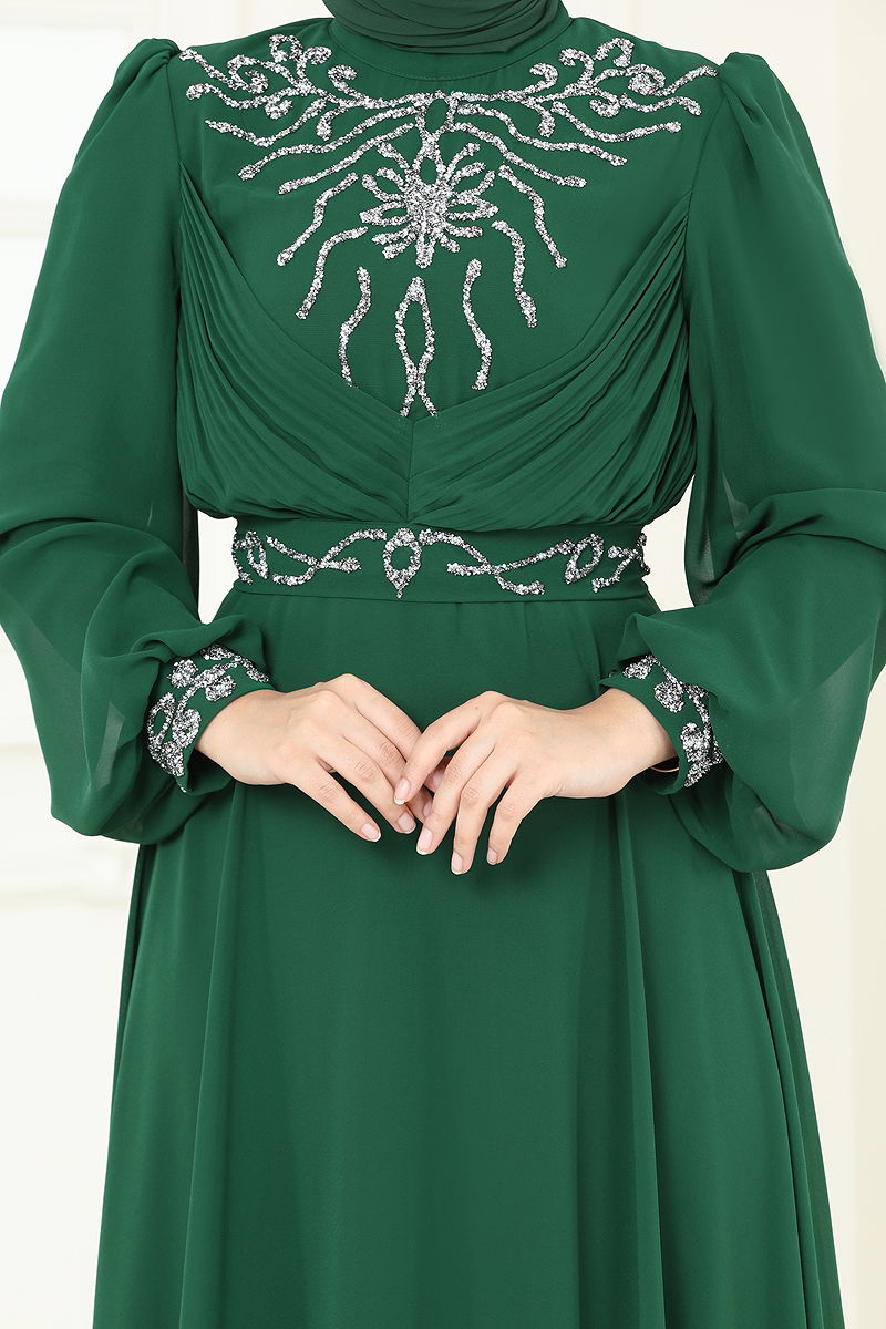 Adorn your modest wardrobe with the Stone-Detailed Chiffon Evening Gown, suitable for all seasons. This gown must be dry cleaned only and is made from chiffon fabric with a lining for comfort. It features a mandarin collar and a zippered back for ease of use. The size exemplified on the model is 38. Stones are appliquéd, and the belt is designed with fixed ends and an unstitched middle part, which can be optionally omitted. Active cuff buttons enhance its practicality.