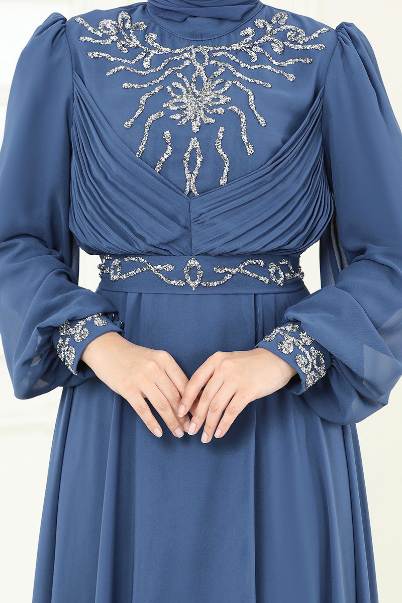 Adorn your modest wardrobe with the Stone-Detailed Chiffon Evening Gown, suitable for all seasons. This gown must be dry cleaned only and is made from chiffon fabric with a lining for comfort. It features a mandarin collar and a zippered back for ease of use. The size exemplified on the model is 38. Stones are appliquéd, and the belt is designed with fixed ends and an unstitched middle part, which can be optionally omitted. Active cuff buttons enhance its practicality.
