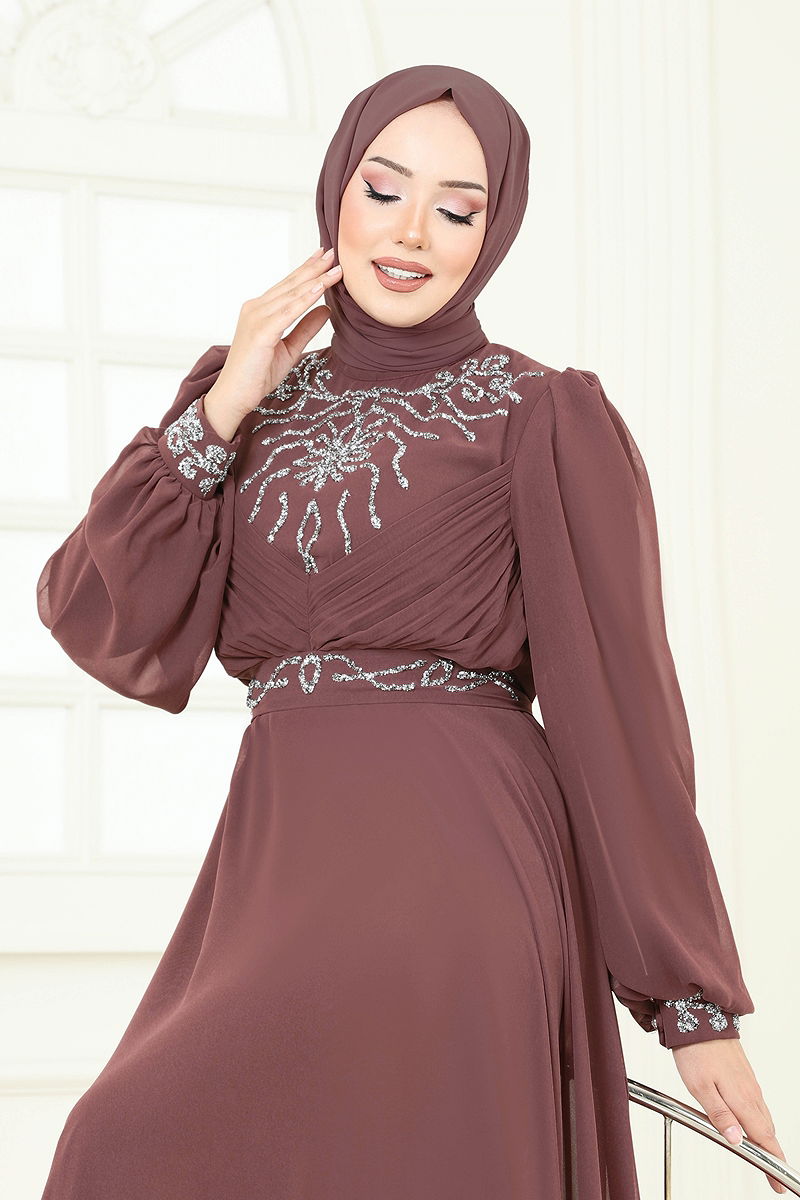 Adorn your modest wardrobe with the Stone-Detailed Chiffon Evening Gown, suitable for all seasons. This gown must be dry cleaned only and is made from chiffon fabric with a lining for comfort. It features a mandarin collar and a zippered back for ease of use. The size exemplified on the model is 38. Stones are appliquéd, and the belt is designed with fixed ends and an unstitched middle part, which can be optionally omitted. Active cuff buttons enhance its practicality.