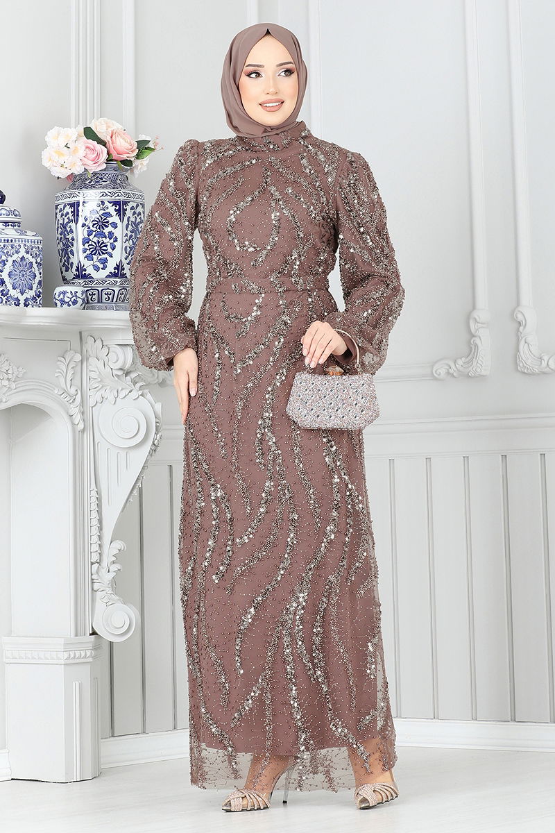 The SUAL Sequin Detail Lined Evening Dress is an elegantly designed modest wear option. Suitable for all seasons, this evening gown is made from tulle fabric and is lined for comfort. The sequin details are hand-sewn, while the bead details are printed. Featuring a mandarin collar and back zipper, it offers both style and practicality. The dress should be dry cleaned only. The product displayed on the model is size 38.