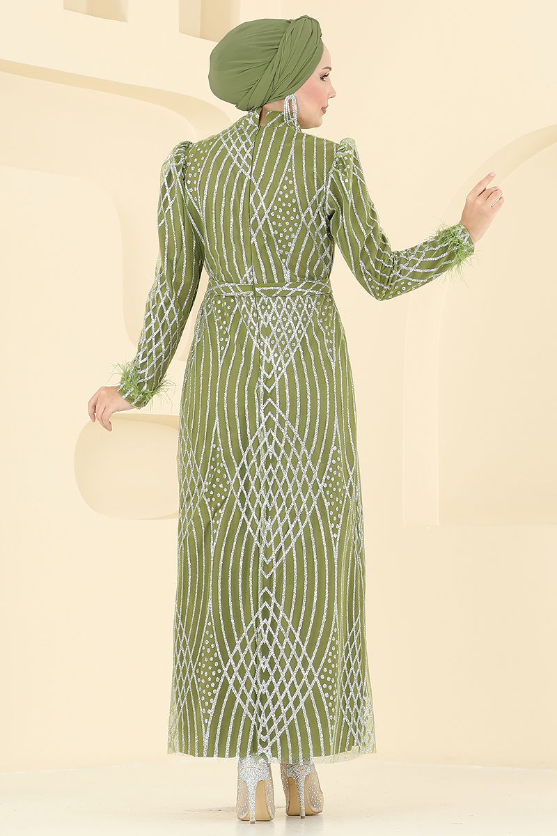 Product Feature : It is a new season hijab fashion product. The product has a Half Throat collar. It is lined. The product has a zipper at the from the back part. The fabric consists of dense glitter. Excess glitter may spill. The product has a stitched waistband. The belt is sewn. There may be a tonal difference in the product due to concept photo shoots.