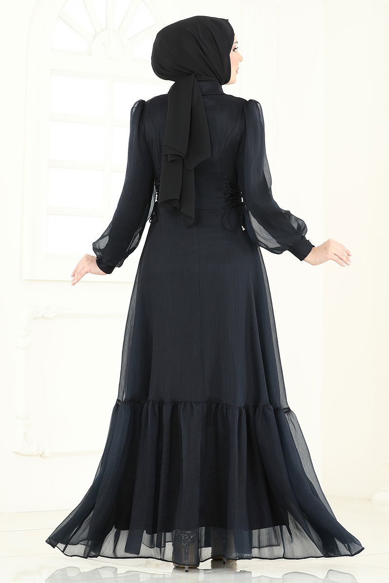 The Belted Evening Dress is a chic and modern choice specially designed for modest wear. The ABİYE model stands out with its shiny fabric and shirt collar design. You can comfortably wear it throughout all seasons. Its front-buttoned and lined structure offers both comfort and elegance. The product should be dry cleaned only. The belted design ensures a perfect fit to the body. The cuff buttons are active and practical. The product displayed is size 38.