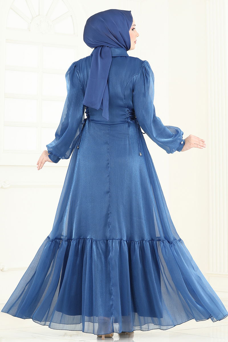 The Belted Evening Dress is a chic and modern choice specially designed for modest wear. The ABİYE model stands out with its shiny fabric and shirt collar design. You can comfortably wear it throughout all seasons. Its front-buttoned and lined structure offers both comfort and elegance. The product should be dry cleaned only. The belted design ensures a perfect fit to the body. The cuff buttons are active and practical. The product displayed is size 38.