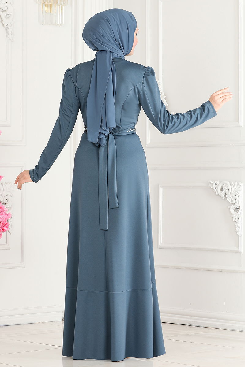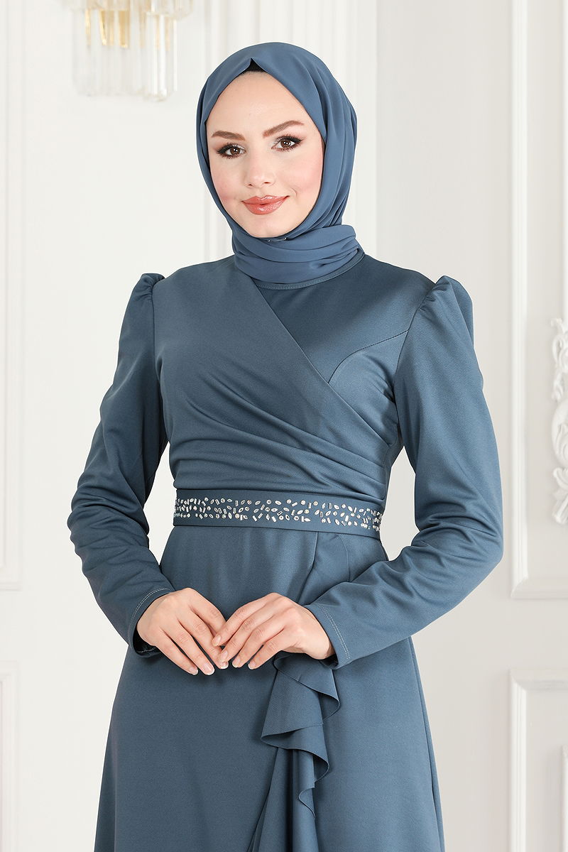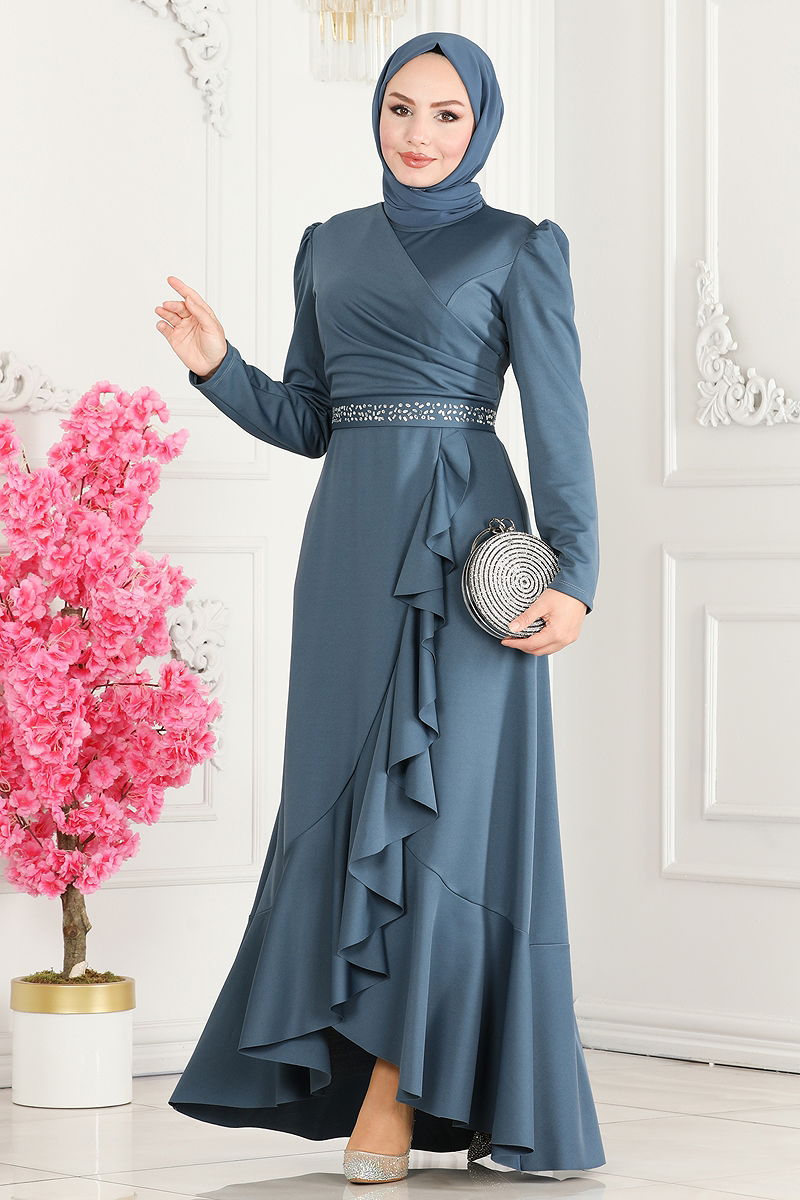 Eteği Volanlı Tesettür Abiye is a TESSEE, four-season model. It should be dry cleaned only. It is made of Dabıl fabric. The product has a bike collar. It is lining-less and has a back zip. (Product on the model is size 38.) The stones are pasted.