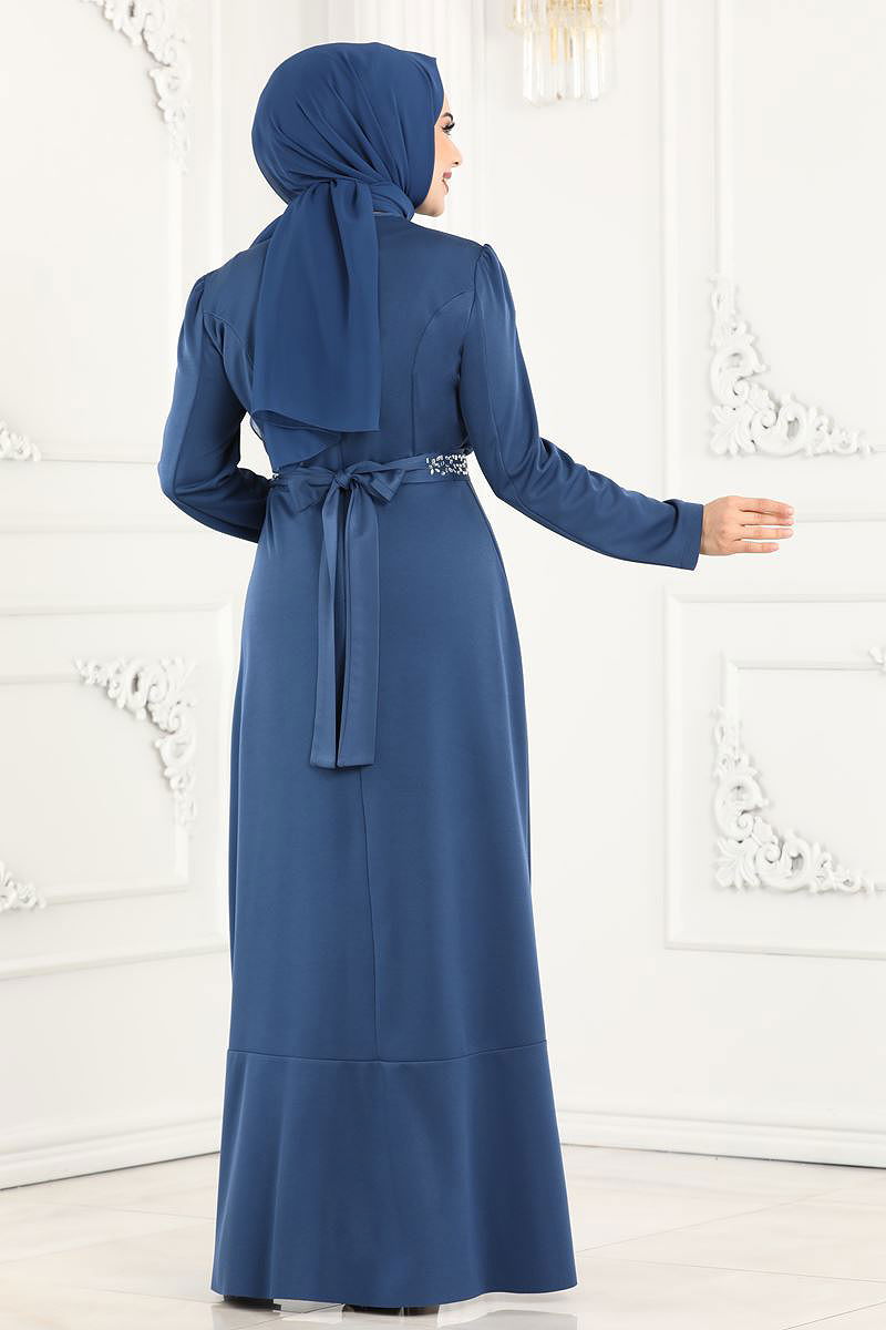 Eteği Volanlı Tesettür Abiye is a TESSEE, four-season model. It should be dry cleaned only. It is made of Dabıl fabric. The product has a bike collar. It is lining-less and has a back zip. (Product on the model is size 38.) The stones are pasted.