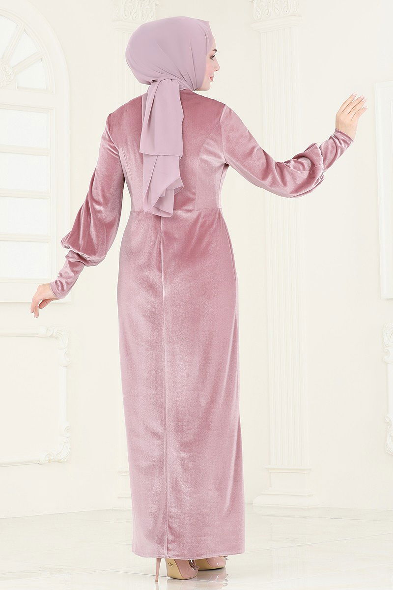 The Draped Velvet Dress is a sophisticated and stylish choice for your special occasions and evening events. With its enchanting velvet texture, this dress will keep you warm during the autumn and winter seasons. Featuring a bicycle collar and a flounced skirt, it offers a modern and elegant posture. The dress is unlined and has buttons at the back for comfortable use . Embellished with glue-on stones, this evening gown will capture all the attention.
