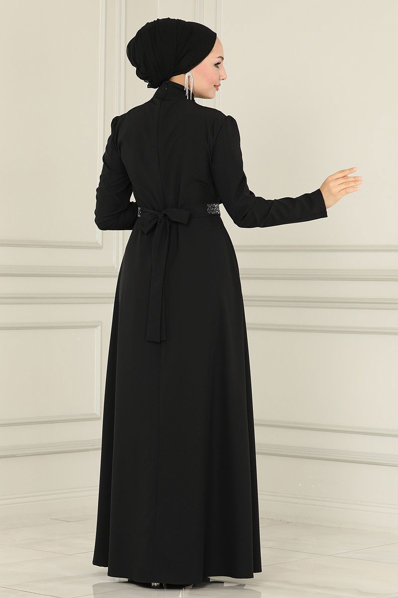 With its elegant and modern design, the Draped Crepe Dress stands out in modest fashion, combining style and comfort. This gown can be comfortably worn across all seasons, and is only suitable for dry cleaning. Made from crepe fabric, the dress features a mandarin collar and a lining-free structure. It comes with a back zipper for easy use and includes a specially designed belt to prevent waviness, which can be optionally omitted. The stone details are adhered to add a delicate sparkle, ensuring a perfect fit with its precise body measurements.