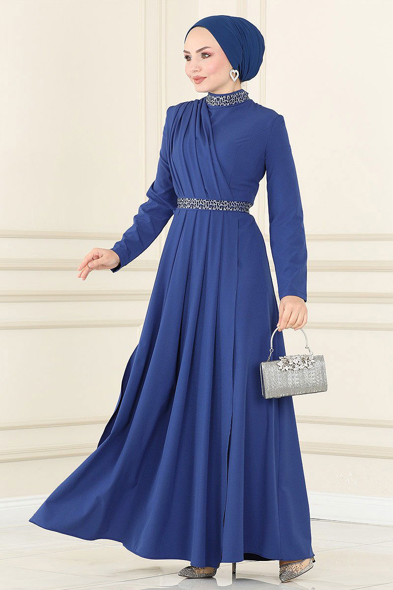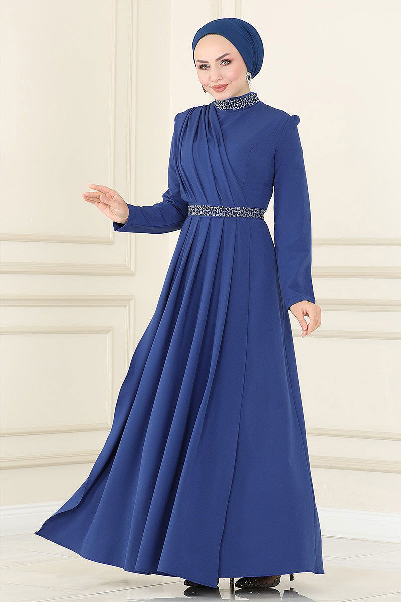 With its elegant and modern design, the Draped Crepe Dress stands out in modest fashion, combining style and comfort. This gown can be comfortably worn across all seasons, and is only suitable for dry cleaning. Made from crepe fabric, the dress features a mandarin collar and a lining-free structure. It comes with a back zipper for easy use and includes a specially designed belt to prevent waviness, which can be optionally omitted. The stone details are adhered to add a delicate sparkle, ensuring a perfect fit with its precise body measurements.