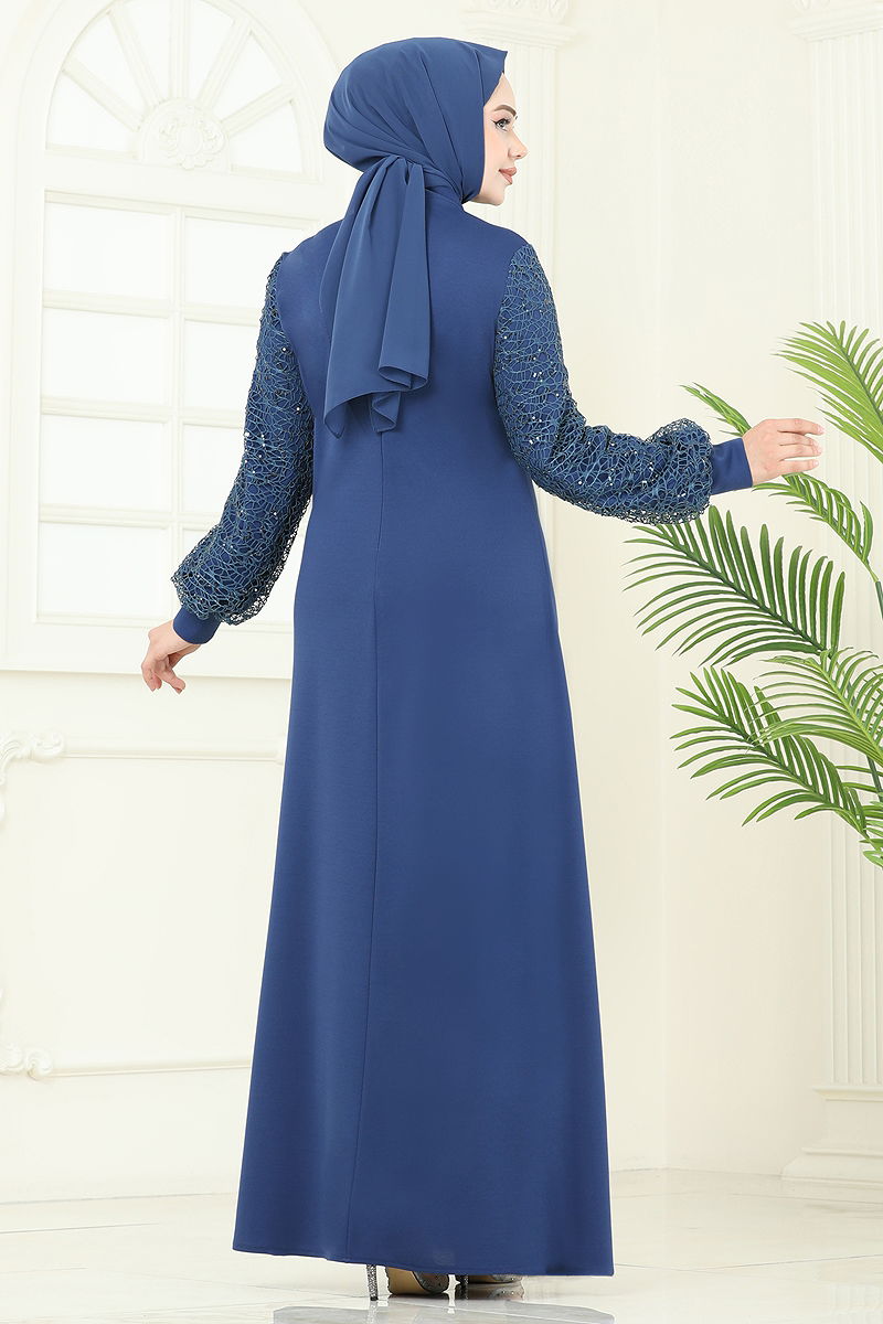 Elegant and chic, this Mesh-Sleeve Evening Dress is perfect for women who embrace modest fashion. Suitable for all four seasons, this dress is made from knitted dabil fabric, ensuring durability. Ideal for important gatherings and special occasions, the dress features a stand-up collar design adding a modern touch, while its unlined structure maintains lightness. Its back-zipper makes it easy to wear. The cardigan is sewn into the dress and should only be dry cleaned. The product shown on the model is a size 38 and is designed with an ideal fit.