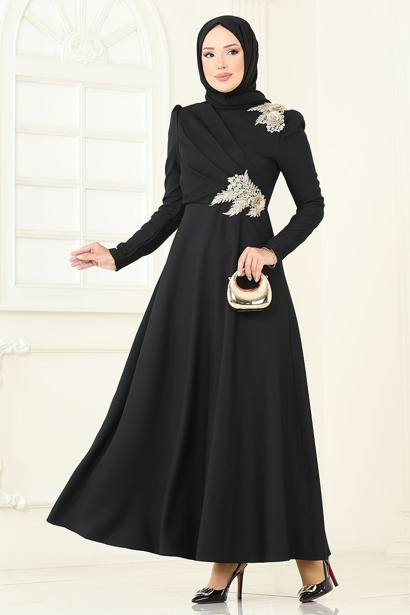 The Gold Lace-Adorned Evening Dress combines elegance and style, designed to dazzle on your special occasions. Suitable for all seasons, this modest evening wear focuses on comfort with its crepe fabric. It features a round neckline and a zipped back, adding a modern touch, while the stitched waist and delicate lace details attract attention. This high-quality dress, which requires dry cleaning, will become an indispensable part of your wardrobe.