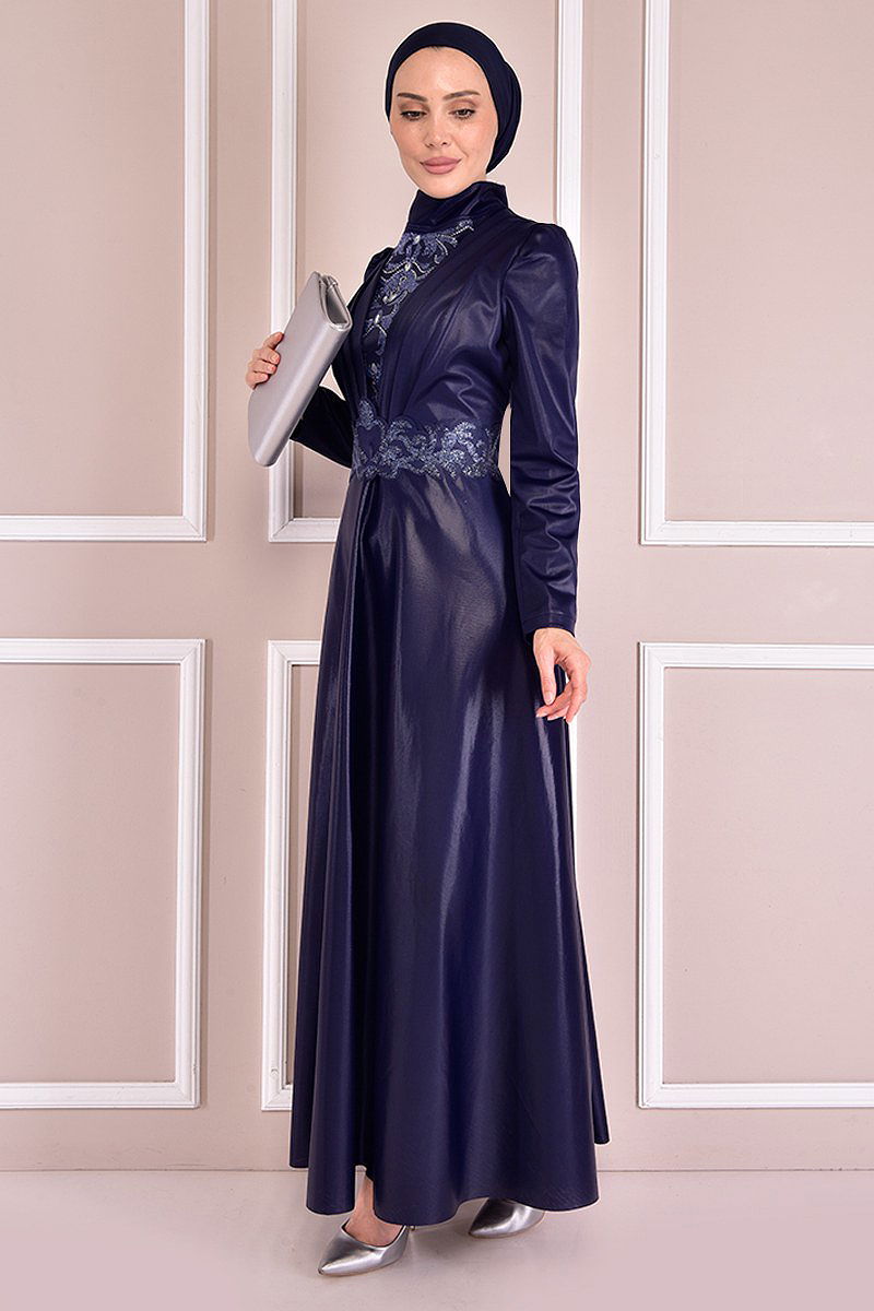 Evening Dresses with Stone Embroidered Belt ASM21357-M Indigo