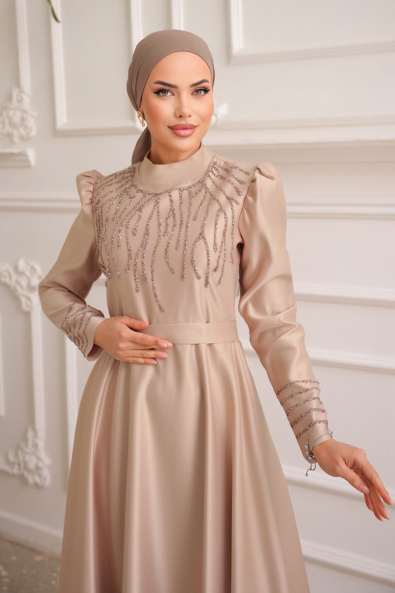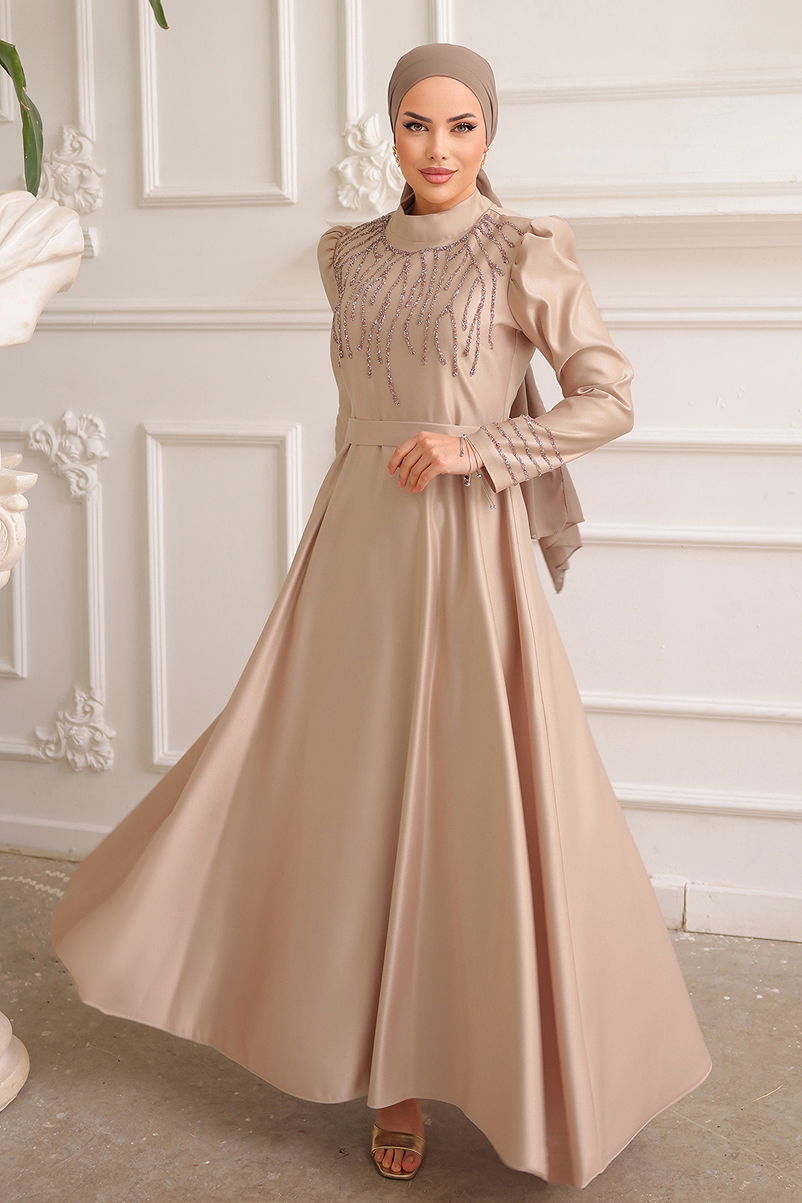 Fabric Property: Made of satin fabric.It can be used in four seasons.Product Feature :It is a new season hijab style product. (Unlined.)Half stand-up collarIt has a functional back zipper.Belt is included, can be used optionally.Stones are sticked on.There may be a tonal difference in the product color due to the concept shots.