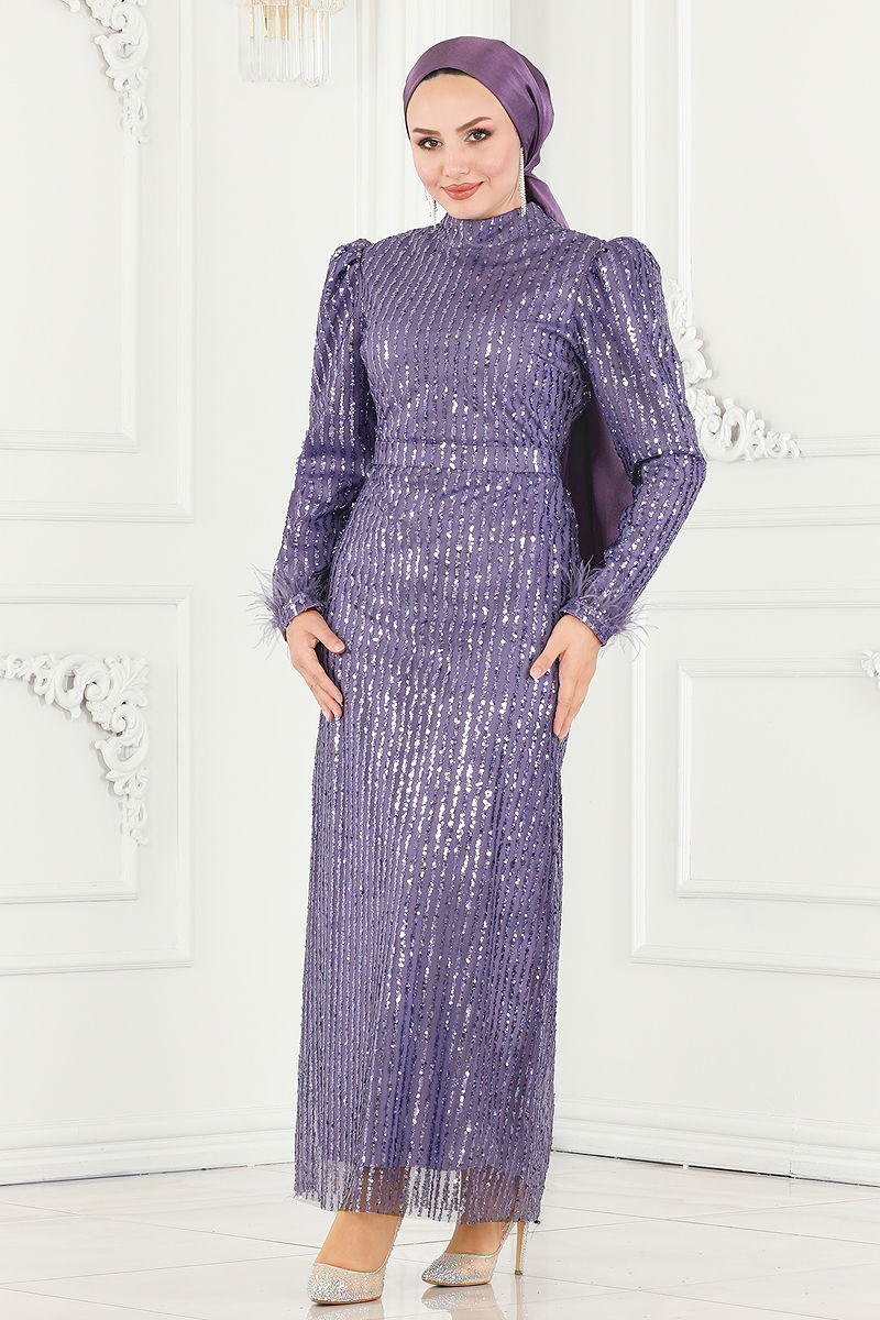 Fabric Property: Made of tulle fabric.It can be used in four seasons.Product Feature :It is a new season hijab style product. (Lined.)Half stand-up collarIt has a functional back zipper.The belt is sewn.Feathers are sewn to the product.Sequins are stickedThere may be a tonal difference in the product color due to the concept shots.
