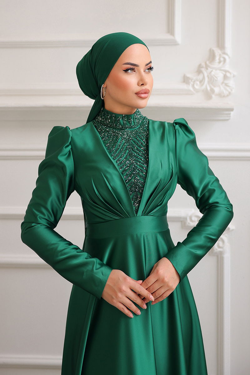 Fabric Property: Made of satin fabric.It can be used in four seasons.Product Feature :It is a new season hijab style product. (Unlined.)Sand-up CollarIt has a functional back zipper.-Stones are sticked on.There may be a tonal difference in the product color due to the concept shots.