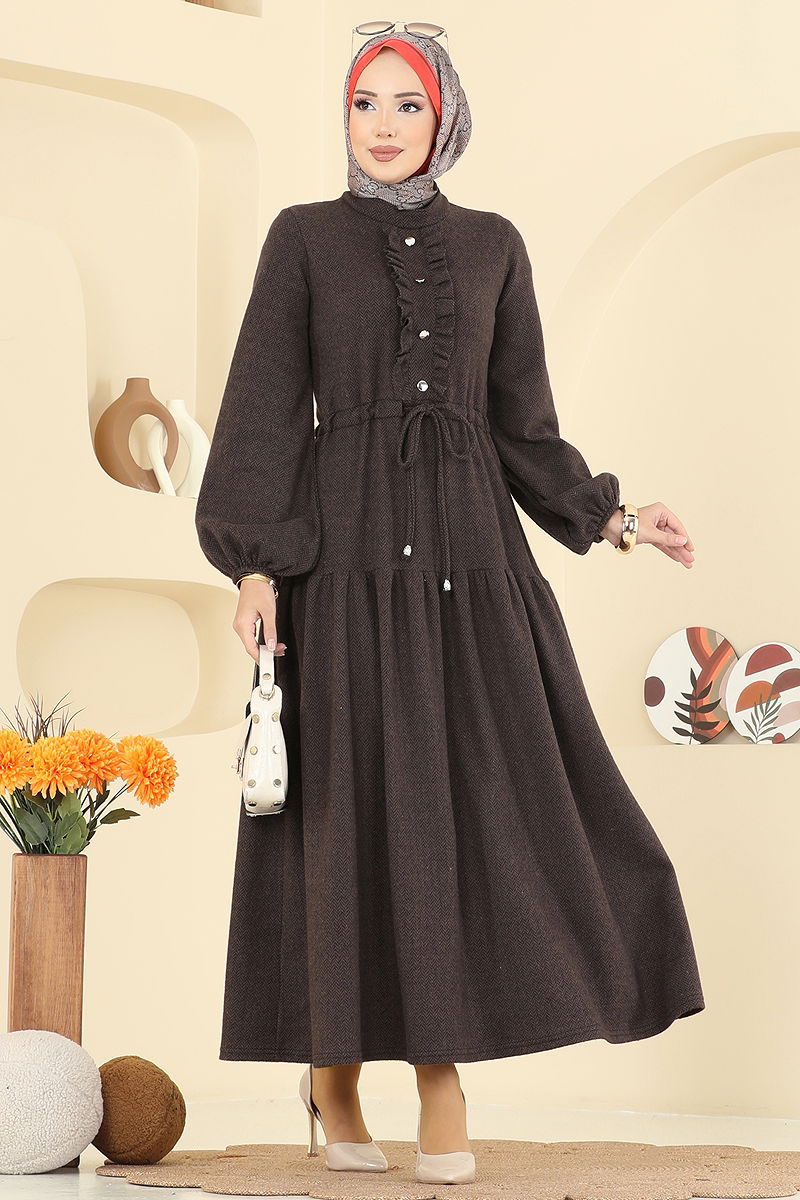Fırfır Detay Beli Tünelli Elbise 24004UKB139 Kahve