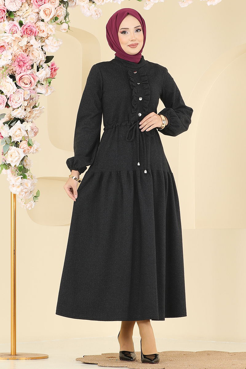 Fırfır Detay Beli Tünelli Elbise, tesettür modasına özel tasarlanmış bir üründür. Sonbahar ve Kış mevsiminde rahatlıkla kullanabileceğiniz bu elbise, 30 derecede hassas yıkama ile temizlenebilir. Balıksırtı kumaştan üretilen bu model, yarım hakim yakaya sahip olup astarsızdır. Sırttan fermuarlıdır ve bağcıklı beli ile rahat bir kullanım sunar. Manşetleri lastikli olan elbise, düğmeleriyle de şık bir görünüm kazandırmaktadır. Model üzerindeki ürün 38 bedendir.