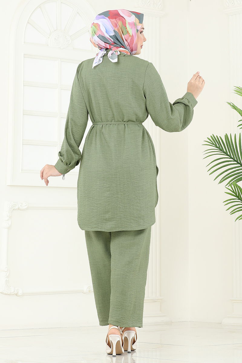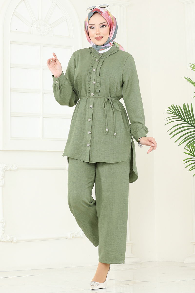 المنتج لديه ياقة نصف بيضوية. المنتج به أزرار من الأمام. البلوز تحتوي على فتحة. غير مبطنة. يتم لصق الحجارة. الحزام متضمن، ،يمكن استخدامها حسب الرغبة البلوزة غير متضمنة. صُنعت عينة من المجموعة مع البلوزة لإظهار الاستخدام المقصود للمنتج. خصر البنطال مرن. أزرار الكفة نشطة. قد يكون هناك اختلاف في الدرجة اللونية في المنتج بسبب التقاط الصور الفوتوغرافية.