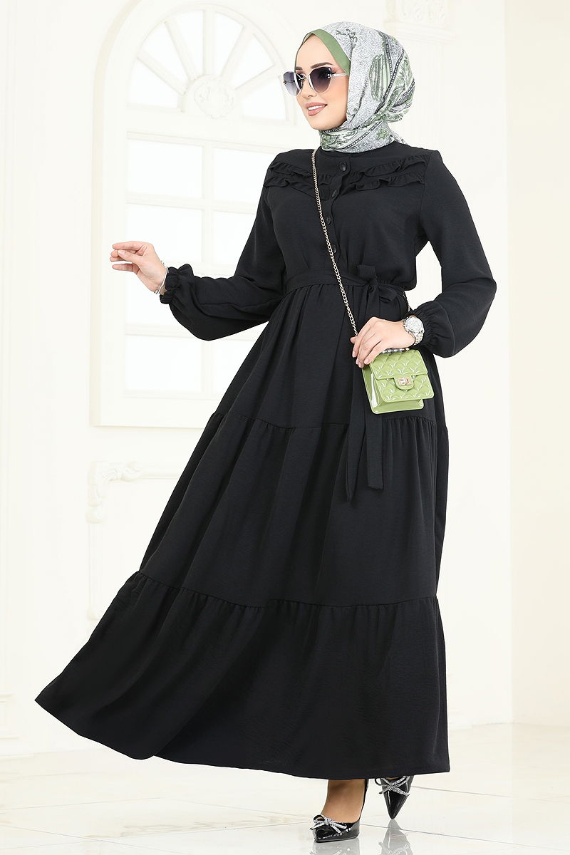 Fırfır Detaylı Aerobin Elbise, tesettür uyumlu bir modeldir. Dört mevsim konforlu kullanım sunan bu elbise, hassas 30 derece yıkamaya uygundur. Aerobin kumaşı tercih edilmiş olup, yarım hakim yaka ve ön yarım düğme detaylarına sahiptir. Astarsız yapıda olan elbise, standart 38 beden ölçülerinde tasarlanmıştır. Kemer, dalgalanmayı önlemek için uçları dikilmiş şekildedir ve kullanımı tamamen sizin tercihinize bırakılmıştır. Manşetler lastiklidir.