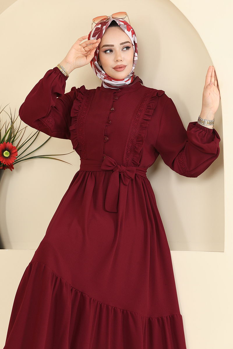 Fırfır Detaylı İthal Krep Elbise Bordo