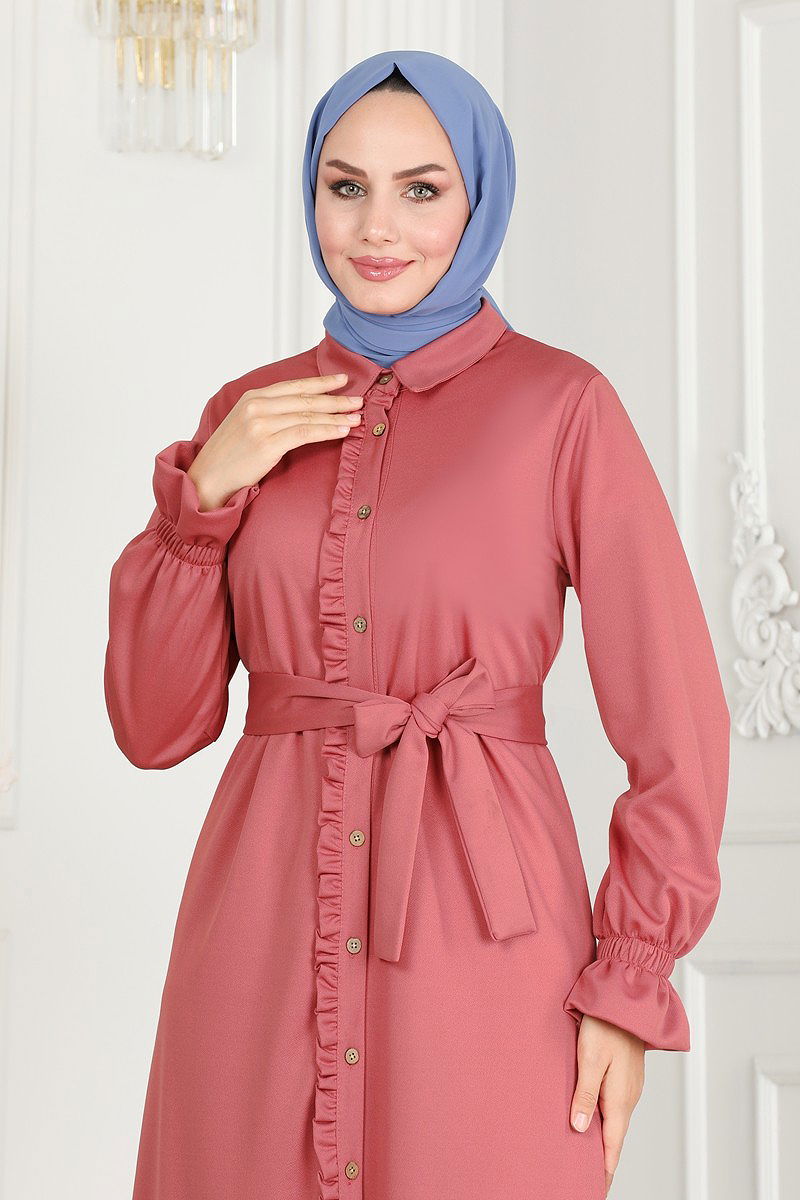 Fırfır Detaylı Tesettür Elbise Gül Kurusu