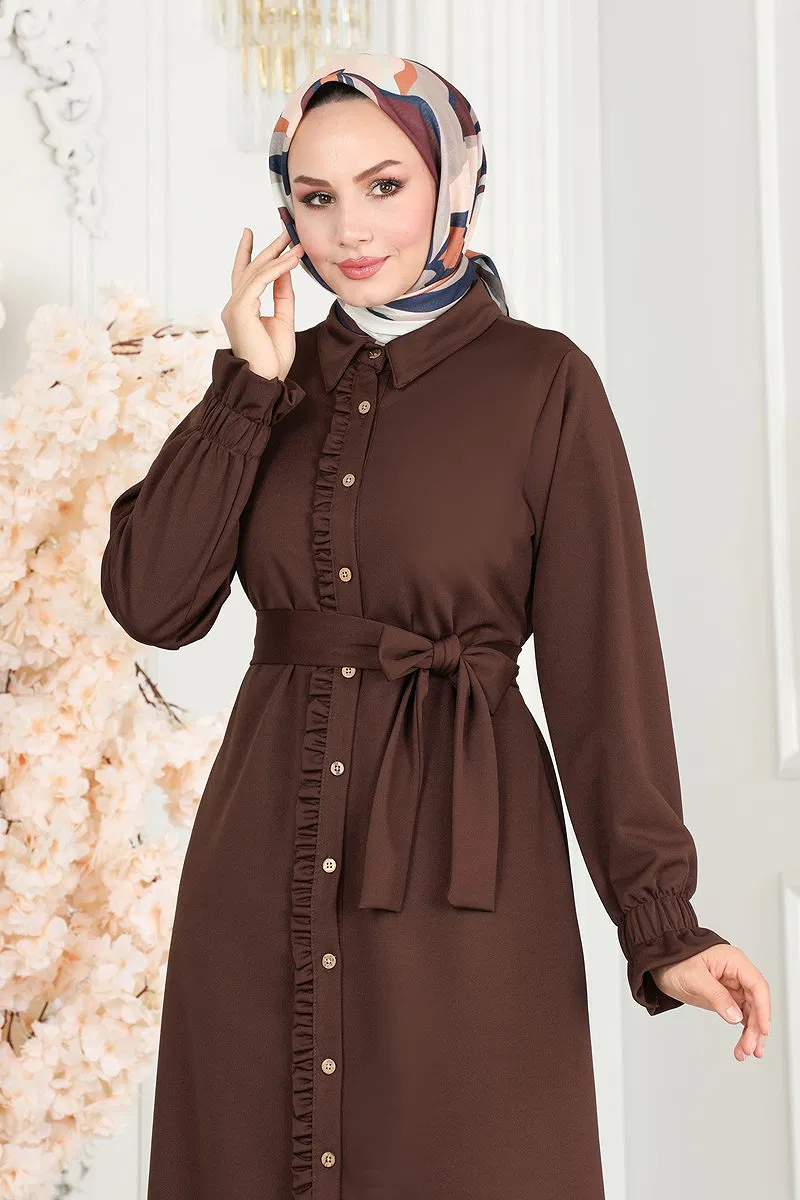 Ürün Özelliği : Yeni sezon tesettür moda ürünüdür. Ürün Gömlek yakadır. Ürün Önden düğmelidir. Ürün Etek kısmından volanlıdır. Astarsızdır. Kemer ürüne dahildir, isteğe bağlı kullanılmayabilir. Manşeti lastiklidir. Konsept fotoğraf çekimlerinden dolayı üründe ton farklılığı olabilir.