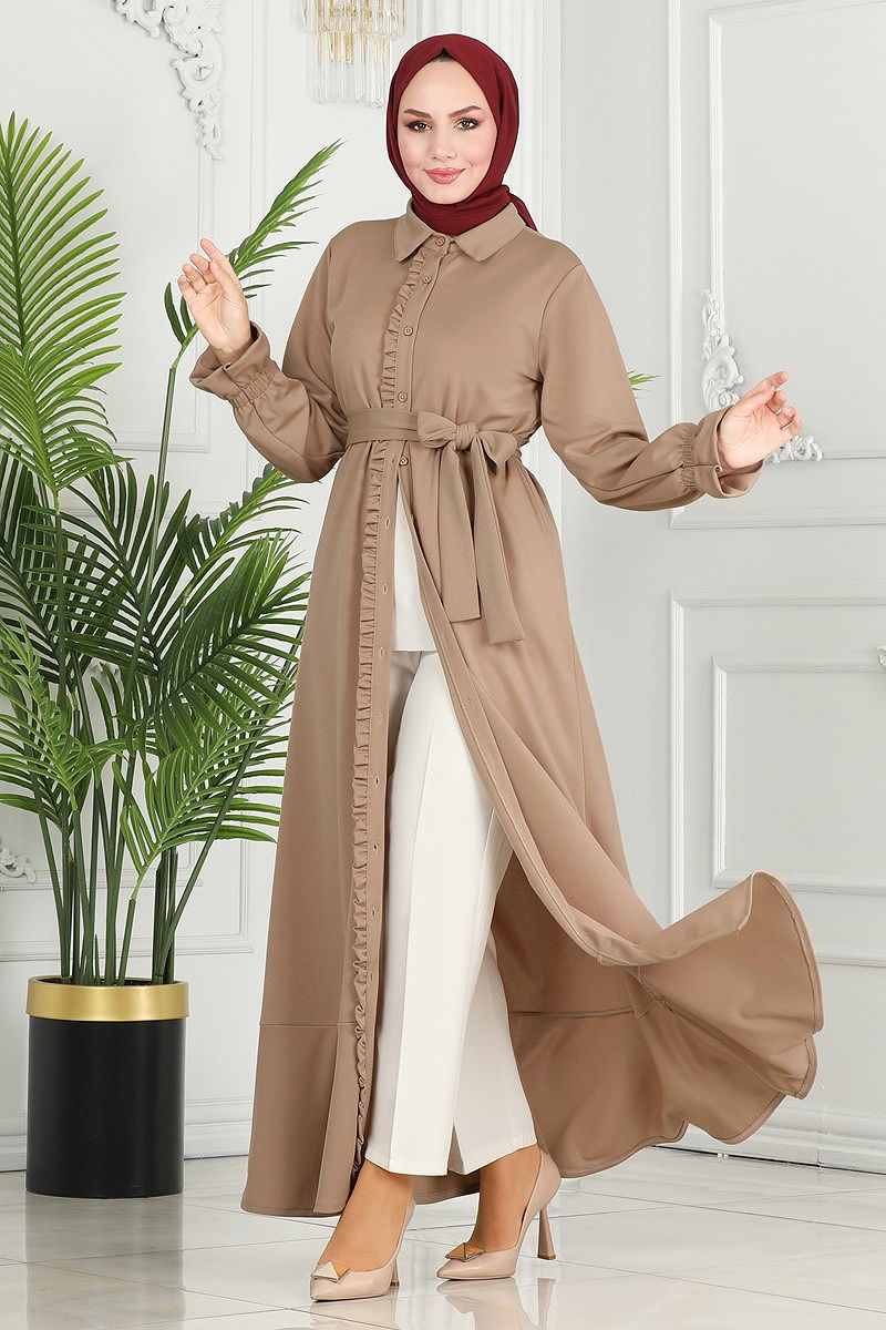 Ürün Özelliği : Yeni sezon tesettür moda ürünüdür. Ürün Gömlek yakadır. Ürün Önden düğmelidir. Ürün Etek kısmından volanlıdır. Astarsızdır. Kemer ürüne dahildir, isteğe bağlı kullanılmayabilir. Manşeti lastiklidir. Konsept fotoğraf çekimlerinden dolayı üründe ton farklılığı olabilir.