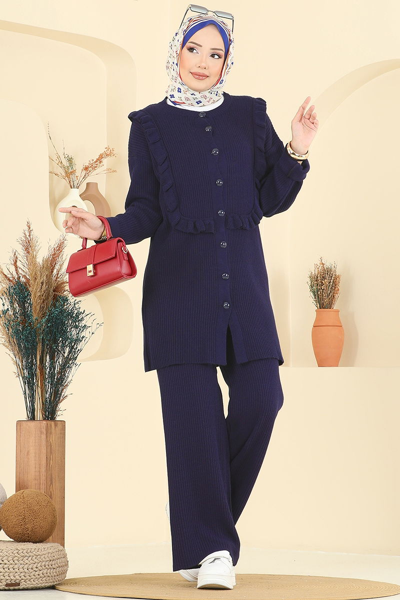 Yeni sezonun vazgeçilmez parçası Fırfır Detaylı Triko Takım , tesettür giyimde şıklığı ve rahatlığı bir arada sunuyor. Sonbahar ve kış aylarınızı sıcacık geçirmenizi sağlayacak bu takım, hassas yıkama özelliği ile de uzun süreli kullanım sunar. Bisiklet yaka ve ön düğmeli tasarım, hem şık hem de pratik bir kullanım sağlar. Pantolonun lastikli beli ise konforunuzu artırır. Standart bedenlere uygun bu takım ile stilinizi ön plana çıkarın.