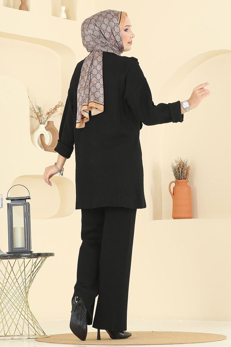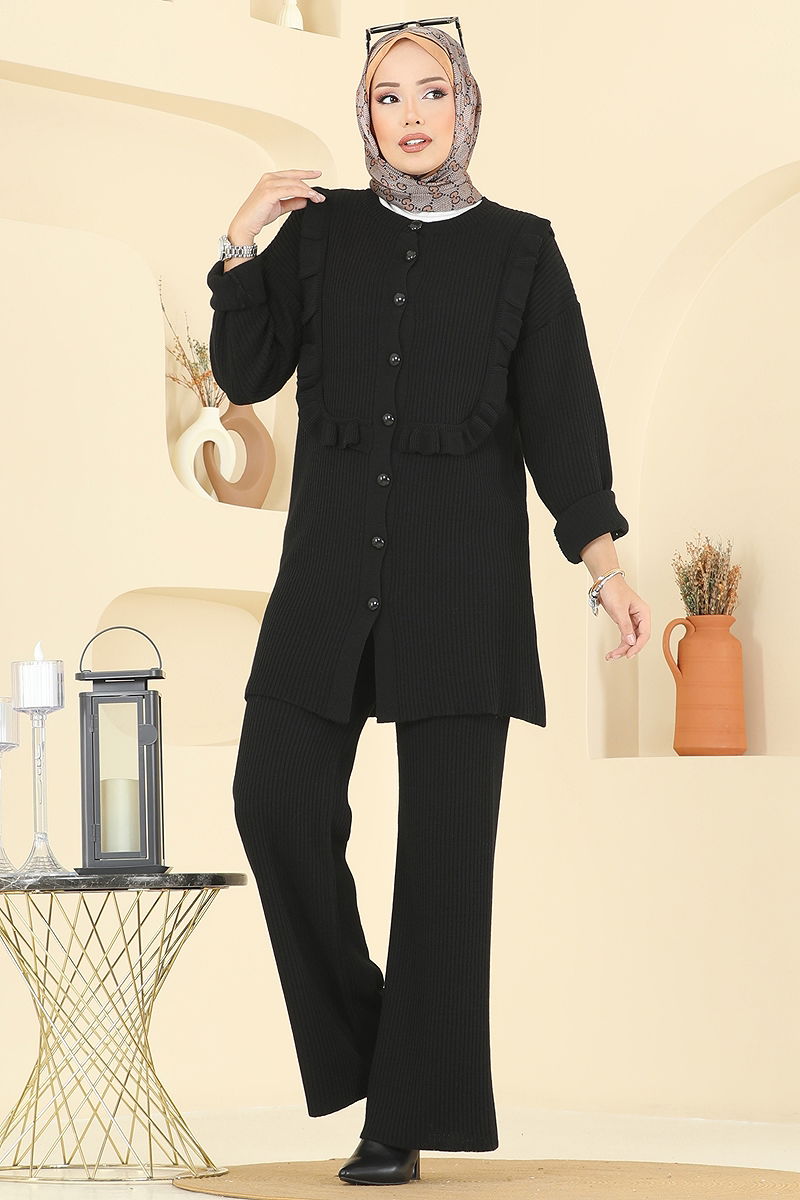 Fırfır Detaylı Triko Takım Siyah