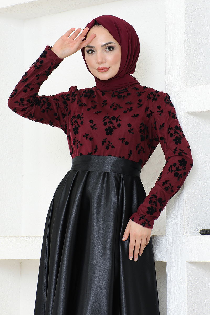 Flok Baskılı Tesettür Abiye Bordo&Siyah Özellikleri