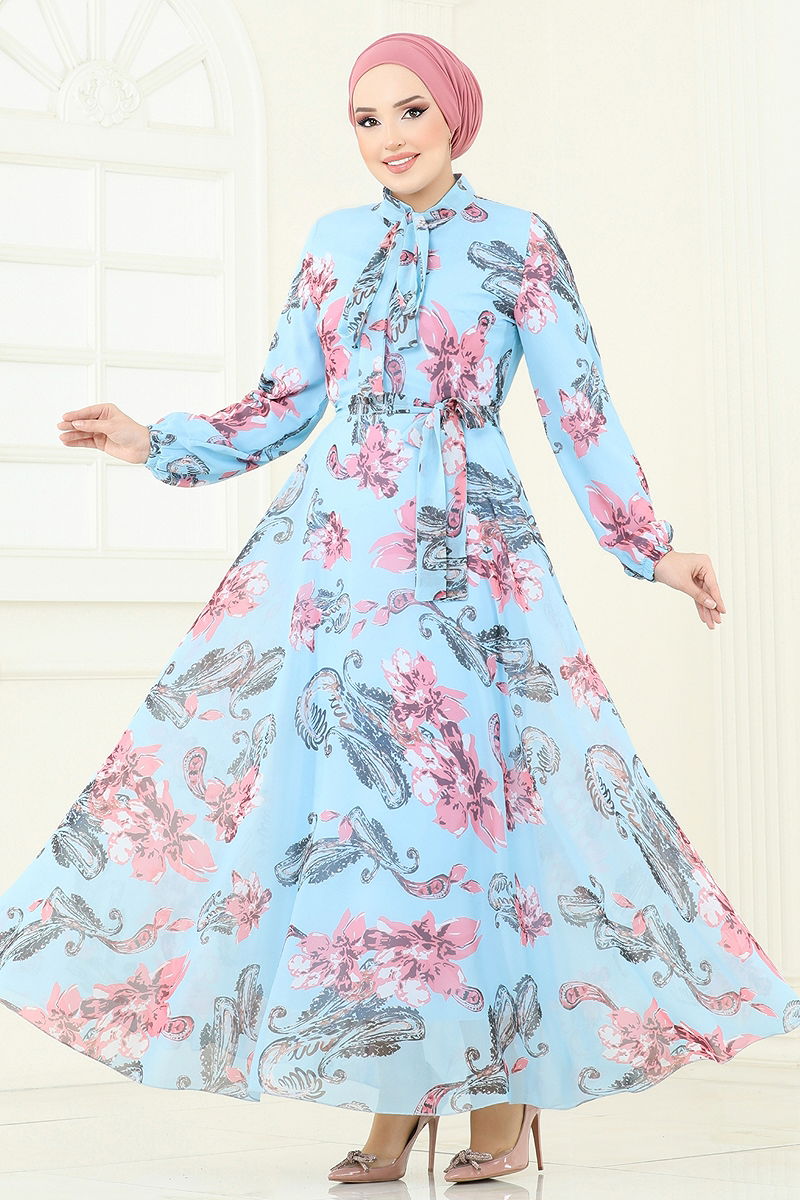 Fular Yakalı Şifon Elbise, şık ve modern bir tesettür ürünüdür. Dört mevsim rahatlıkla giyilebilir. Hassas yıkama modunda 30 derecede yıkanabilir. Şifon kumaştan üretilmiş bu elbise, astarlıdır ve sırt kısmından fermuarlı olarak tasarlanmıştır. Fular yakası ile dikkat çekici bir görünüme sahiptir. Ürünün arka kısmında kullanışlı bir düğme bulunur ve kemer iki ucundan dikilmiş, ortası boş bırakılarak tasarlanmıştır. Kemer isteğe bağlı olarak kullanılabilir ve manşetleri lastiklidir. Modelimiz 38 bedendir.