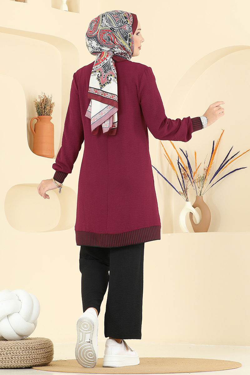 Garni Detail Suit is a modest fashion product suitable for all seasons. Made from special Aerobin fabric, it is light and breathable. It offers easy care with gentle wash at 30 degrees. The suit features a crew neck design and is unlined. The dress is a pullover, and the pants have an elastic waist. Ideal for both stylish and comfortable wear. (Displayed product is size 38.)