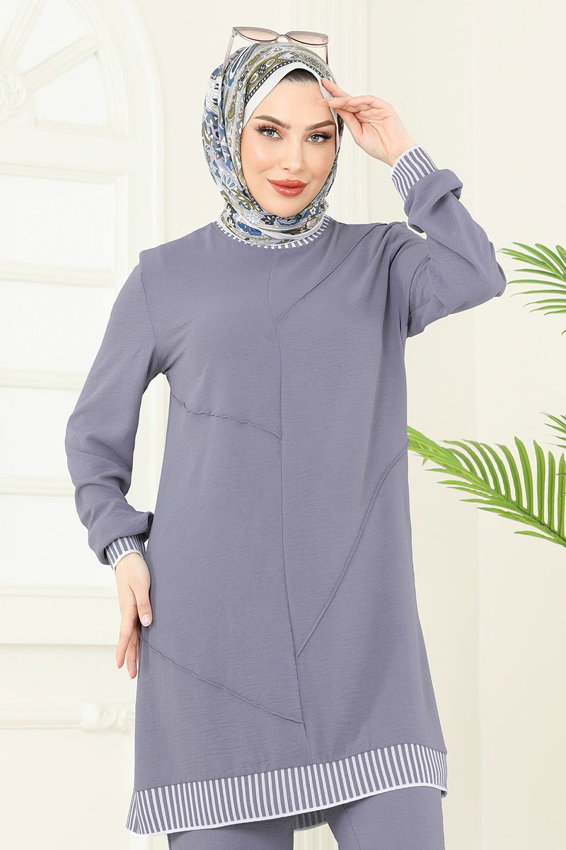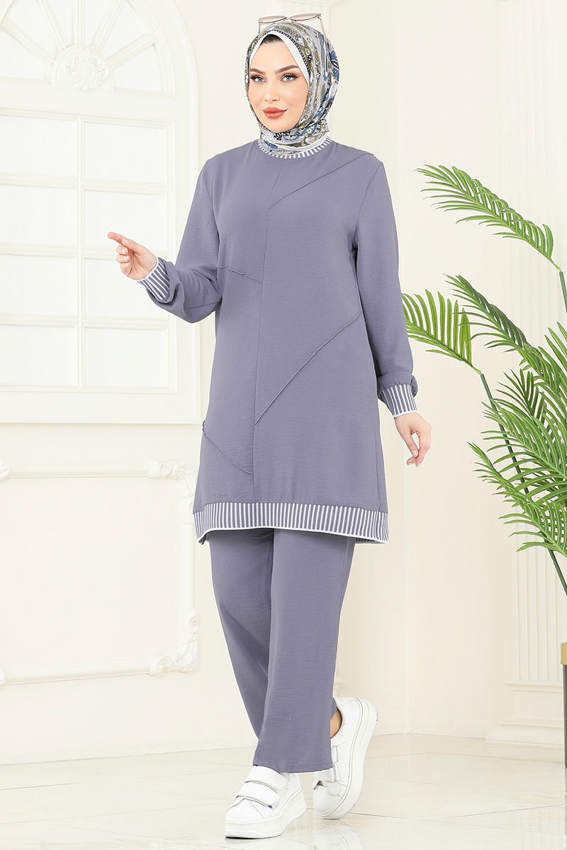 Garni Detail Suit is a modest fashion product suitable for all seasons. Made from special Aerobin fabric, it is light and breathable. It offers easy care with gentle wash at 30 degrees. The suit features a crew neck design and is unlined. The dress is a pullover, and the pants have an elastic waist. Ideal for both stylish and comfortable wear. (Displayed product is size 38.)