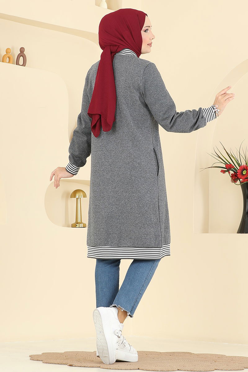 Garni Detay Armalı Kap, sonbahar ve kış sezonları için tasarlanmış şık bir tesettür ürünüdür. Özenle dikilmiş arma detaylarına sahip bu kap, modern ve elegan bir görünüm sunar. Yarım hakim yakası ve önden düğmeli tasarımı ile pratik bir kullanım sağlar. 30 derecede hassas yıkama ile temizlenebilir ve astarsız yapısıyla hafif bir kullanım hissi verir. Modelin üzerindeki 38 beden örneği, ürünün standart kalıplarını göstermektedir.