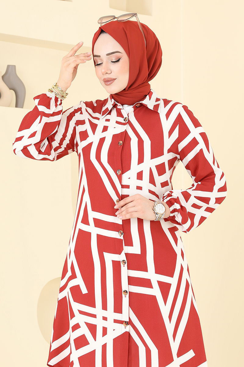 Geometrik Desen Viskon Tunik Kırmızı&Ekru
