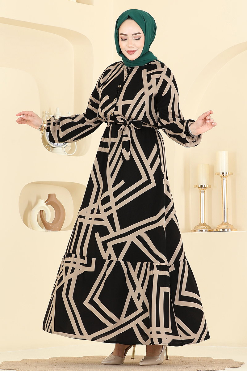 Geometrik Desenli Kuşaklı Elbise 7162BG354 Siyah