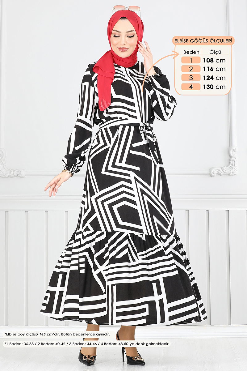 Bu şık geometrik desenli viskon elbise, dört mevsim boyunca rahatlıkla kullanılabilir. Elde yıkama ile temizlenmesi önerilir. Yarım hakim yaka ve astarsız tasarımı ile modern bir görünüm sunar. Sırttan fermuar detayı ile pratik bir kullanım sağlar. Kemer, dalgalanmayı önlemek için özel olarak dikilmiştir ve isteğe bağlı olarak çıkarılabilir. Manşeti lastikli olan bu elbise, model tesettür ürünüdür ve şıklığı konforla birleştirir.