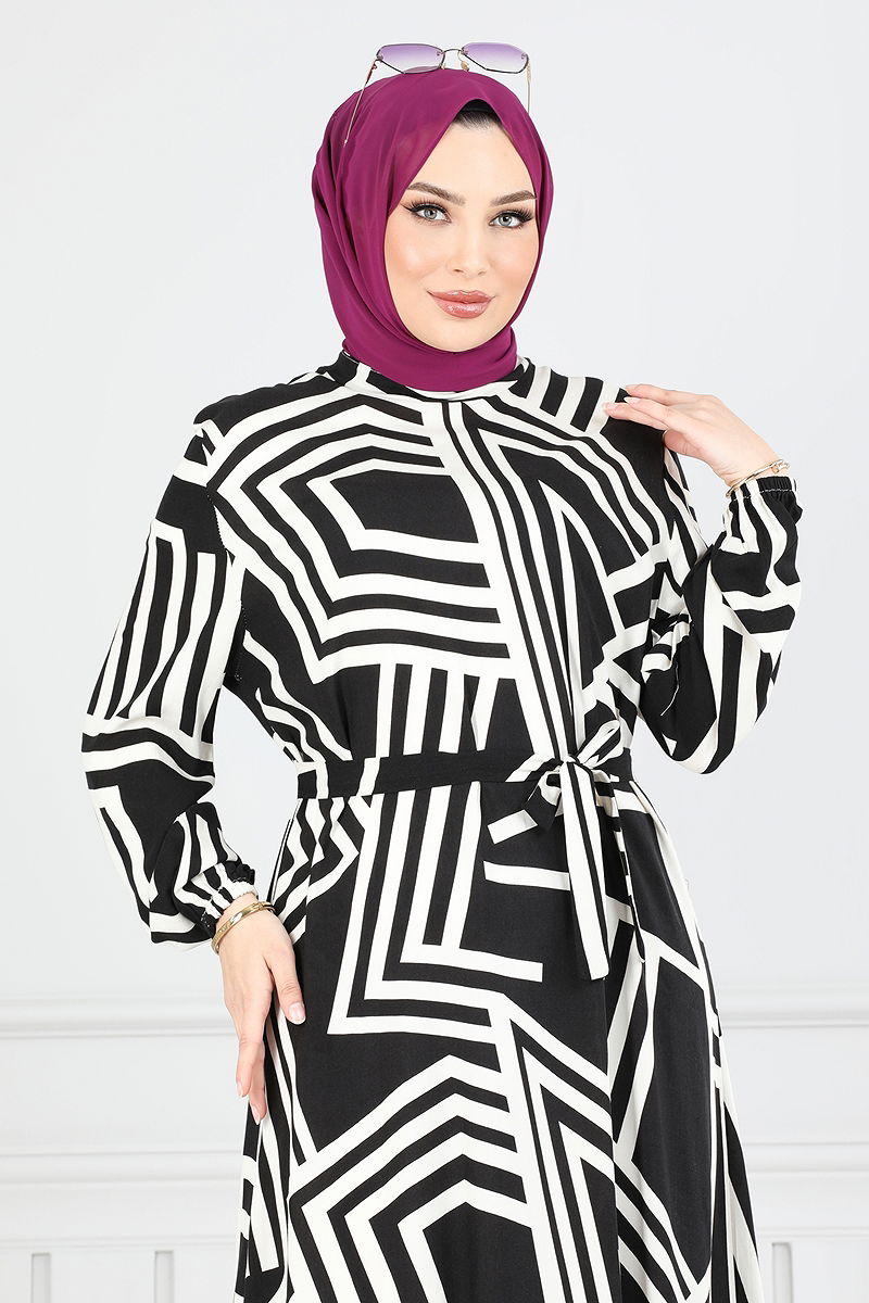 Geometrik Desenli Viskon Elbise Vizyon&Siyah