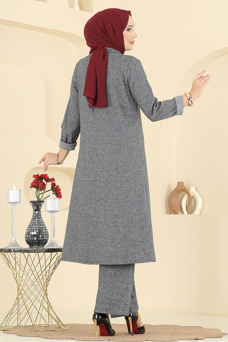 Gizli Düğmeli Balıksırtı Takım , özenle tasarlanmış bir tesettür giyim ürünüdür. Sonbahar ve kış aylarında rahatlıkla kullanılabilir. Hassas kumaşı sayesinde 30 derecede yıkanabilir özelliğe sahiptir. Gömlek yakası ve gizli düğmeleri ile şık bir görünüm sunar. Balıksırtı desenli bu takım, şıklığı konforla buluşturur. Pantolonun elastik beli, gün boyu rahat bir kullanım sağlar. Tunik ve pantolon şık bir bütünlük oluşturur.