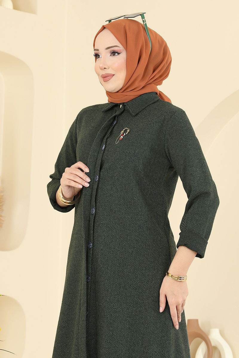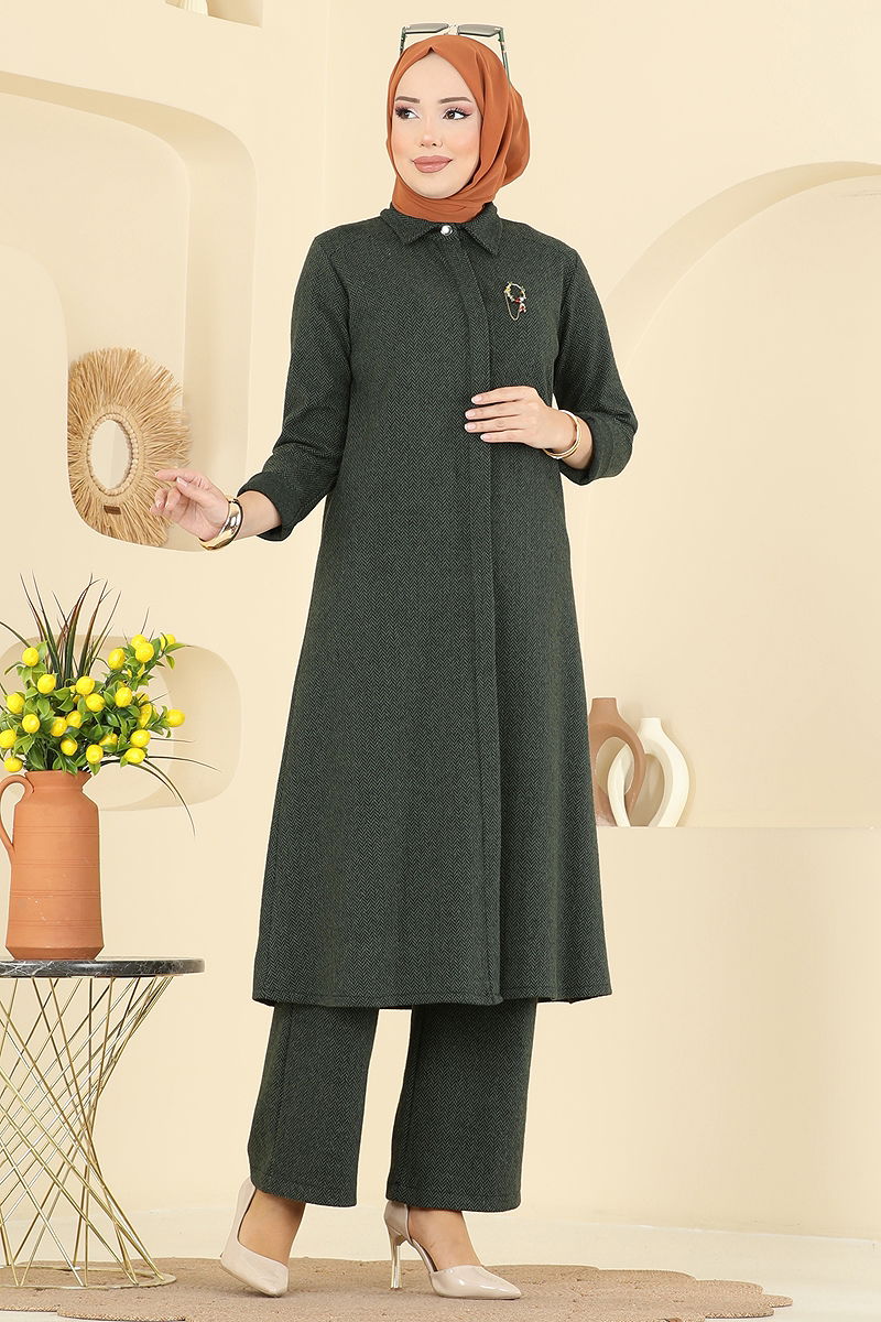 Gizli Düğmeli Balıksırtı Takım , özenle tasarlanmış bir tesettür giyim ürünüdür. Sonbahar ve kış aylarında rahatlıkla kullanılabilir. Hassas kumaşı sayesinde 30 derecede yıkanabilir özelliğe sahiptir. Gömlek yakası ve gizli düğmeleri ile şık bir görünüm sunar. Balıksırtı desenli bu takım, şıklığı konforla buluşturur. Pantolonun elastik beli, gün boyu rahat bir kullanım sağlar. Tunik ve pantolon şık bir bütünlük oluşturur.