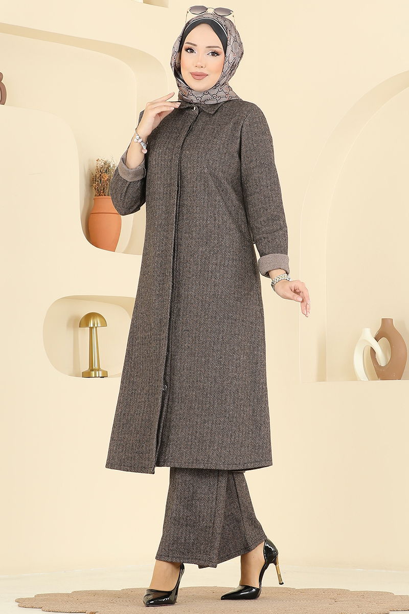 Gizli Düğmeli Balıksırtı Takım , özenle tasarlanmış bir tesettür giyim ürünüdür. Sonbahar ve kış aylarında rahatlıkla kullanılabilir. Hassas kumaşı sayesinde 30 derecede yıkanabilir özelliğe sahiptir. Gömlek yakası ve gizli düğmeleri ile şık bir görünüm sunar. Balıksırtı desenli bu takım, şıklığı konforla buluşturur. Pantolonun elastik beli, gün boyu rahat bir kullanım sağlar. Tunik ve pantolon şık bir bütünlük oluşturur.