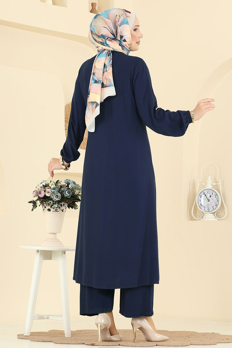 Belmando Takım modeli, gizli düğme detayları ile dikkat çekici bir tesettür ürünüdür. Dört mevsim rahatlıkla kullanabileceğiniz bu tasarım, hassas yıkama ile 30 derecede yıkanabilir özelliklere sahiptir. Gömlek yakalı ve astarsız olan üst tunikte ve elastik beli pantolonda konfor ve şıklık bir arada sunulmaktadır. Özel Belmando kumaşından üretilmiş olan bu takım, üzerinizde zarif bir duruş sağlayacaktır. Ürünün tunik kısmında ve pantolon manşetlerinde bulunan lastikler sayesinde hareket özgürlüğü sunar.
