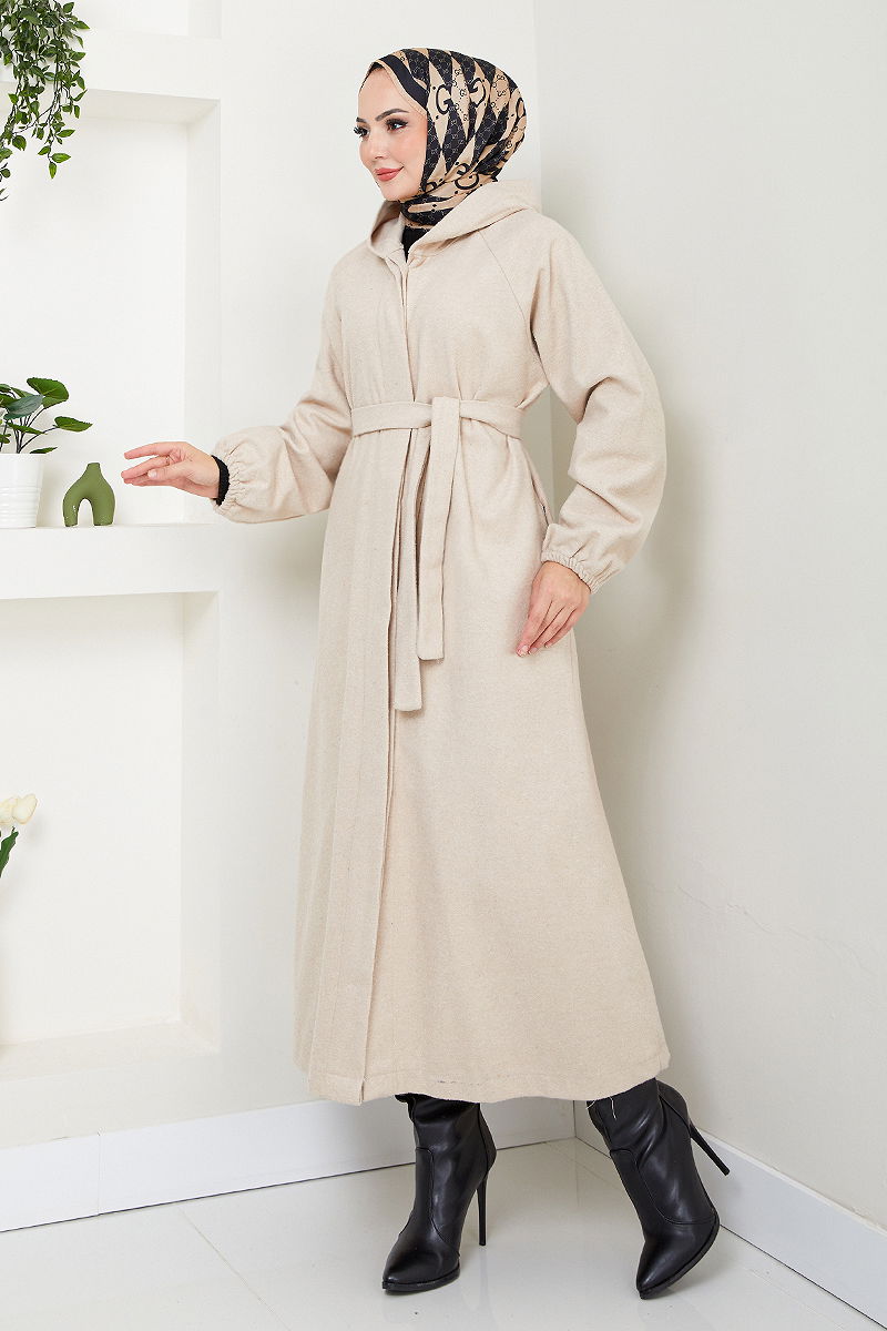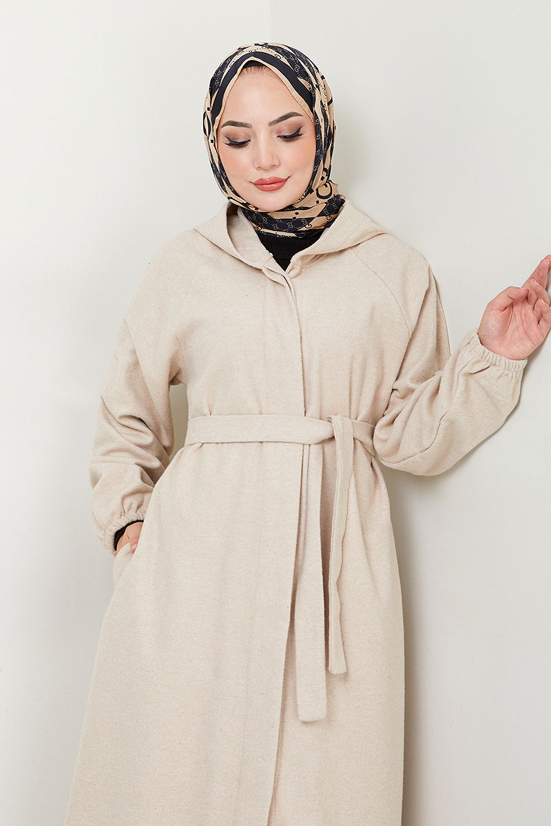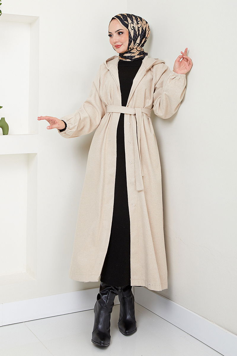 The Hidden Button Coat is a coat model for modest fashion. It can be used in Autumn and Winter seasons. It should be washed at 30 degrees without spinning. It is made of first-class Cashmere fabric. The product has a Bicycle collar and no lining. (The product on the model is size 1.) It has usable buttons at the front. The two ends of the belt are sewn to prevent fluttering, and the middle part is left empty (seamless). The belt is included with the product and can be optionally used. It has a pocket. The cuff is elasticized.