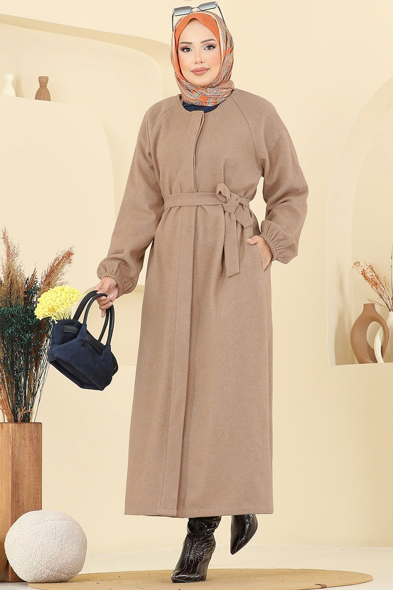 Gizli Düğmeli Kaşe Kaban modeli, tesettür giyimine uygun bir sonbahar ve kış sezonu ürünüdür. 30 derecede sıkma yapılmadan yıkanması önerilir. Birinci sınıf kaşe kumaştan üretilmiştir ve bisiklet yaka tasarımına sahiptir. Astarsızdır ve önünde kullanılabilir düğmeler bulunmaktadır. Kemerin dalgalanmaması için iki ucu dikilmiş, orta kısım boş (dikişsiz) bırakılmıştır. Kemer ürüne dahildir, isteğe bağlı olarak kullanılabilir. Cep detayı mevcut olup, manşet lastiklidir. Ürün modelin üzerindeki kişiye uygundur.
