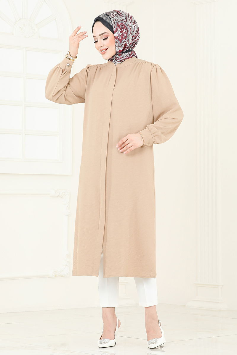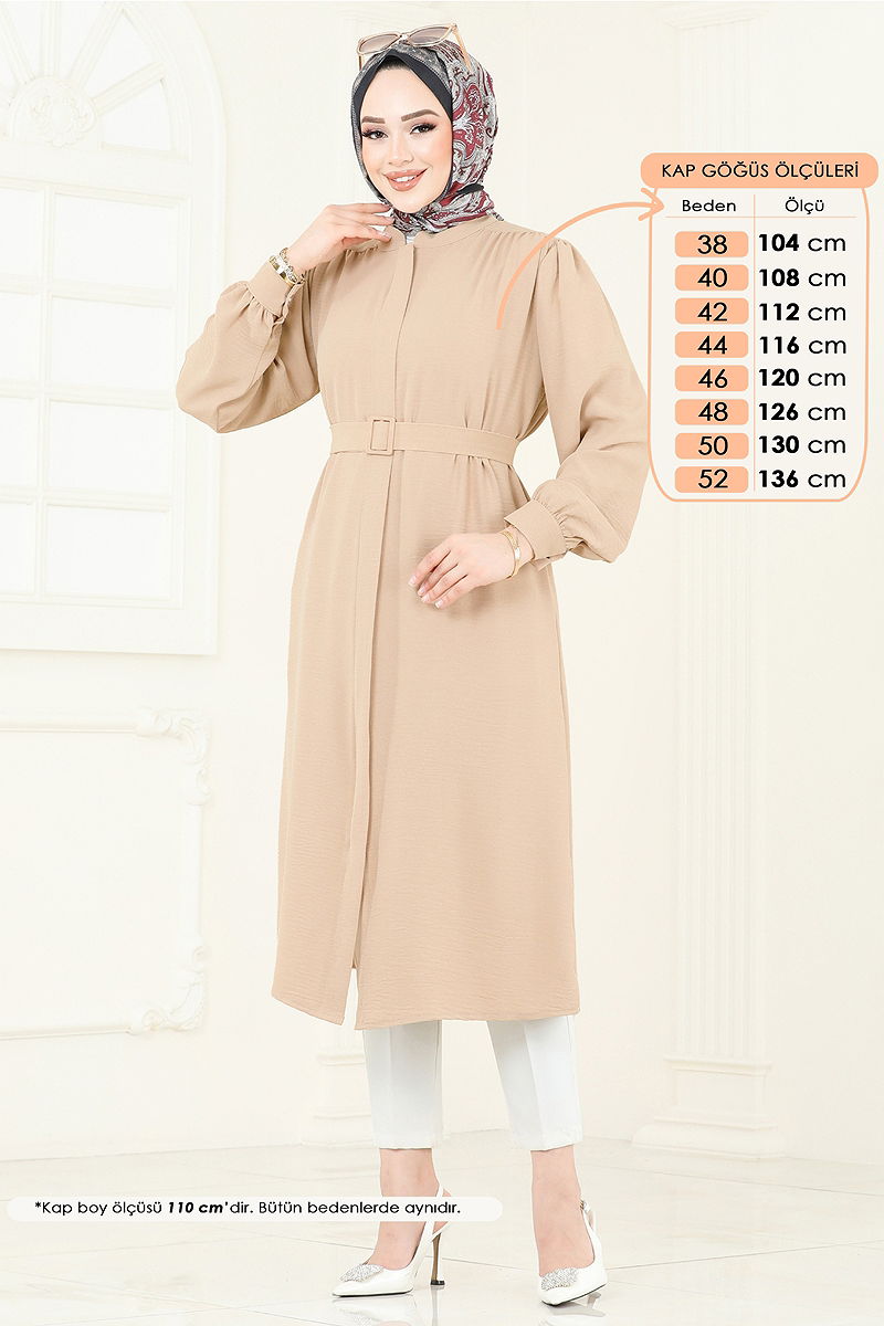 Gizli Fermuarlı Tesettür Kap, özel tasarımlı dört mevsim kullanımına uygun bir kap modelidir. 30 derecede hassas yıkama programında yıkanabilen bu ürün, hava alan aerobin kumaştan üretilmiştir. Yarım hakim yaka ve astarsız tasarımı ile konfor sağlar. Önden fermuarlı olması, giyimi kolaylaştırır. Kemer, dalgalanmayı önlemek için uçları dikilmiş şekilde tasarlanmıştır ve isteğe bağlı olarak çıkarılabilir. Manşetlerdeki düğmeler aktif kullanıma sahiptir. Modelin üzerindeki ürün 38 bedendir.